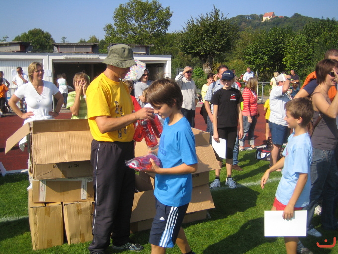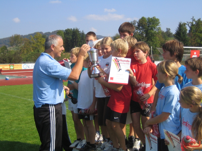 Beschreibung: Kreis-Sportwart Roland Mäußnest bei der Pokalübergabe an das siegreiche Knirpse-Team TG Geislingen/TV Altenstadt