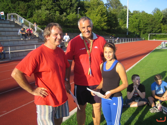 Beschreibung: Schülerwart Jochen Schreitmüller und Sportwart Roland Mäußnest beglückwünschen den „Mannschaftskapitän“ Lena Becher von der LG Voralb zum Gesamtsieg