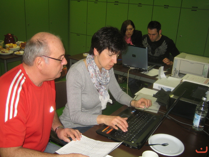 Beschreibung: Elmar Münkle und Birgit Täubert bei der Wettkampfauswertung