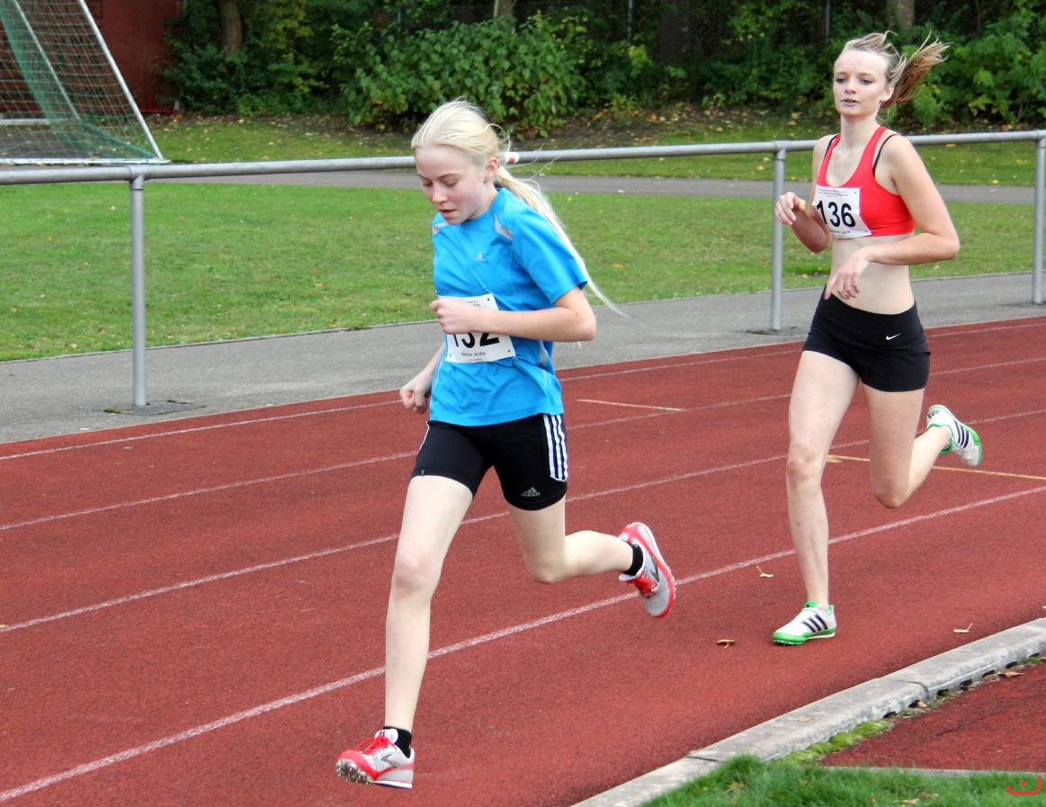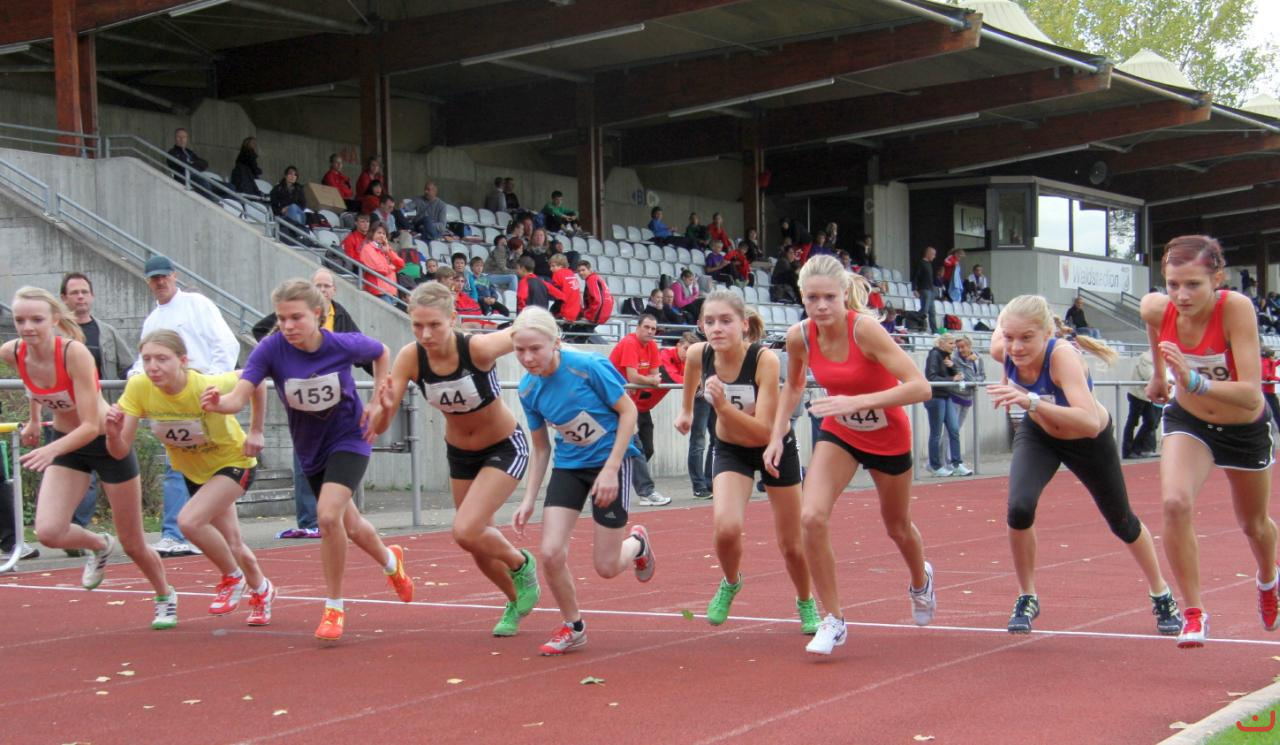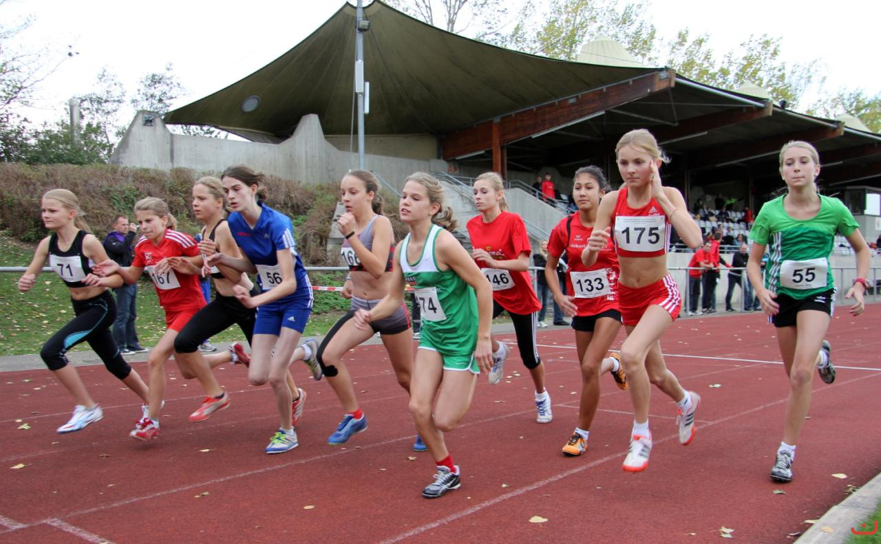 • Beschreibung: Jana Kammerer (ganz links), Anika Hehrer (132) und Maike Rosenberger (144) beim Start des 800 m-Laufs der Schi A